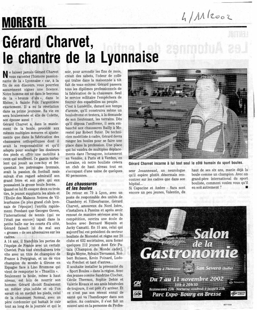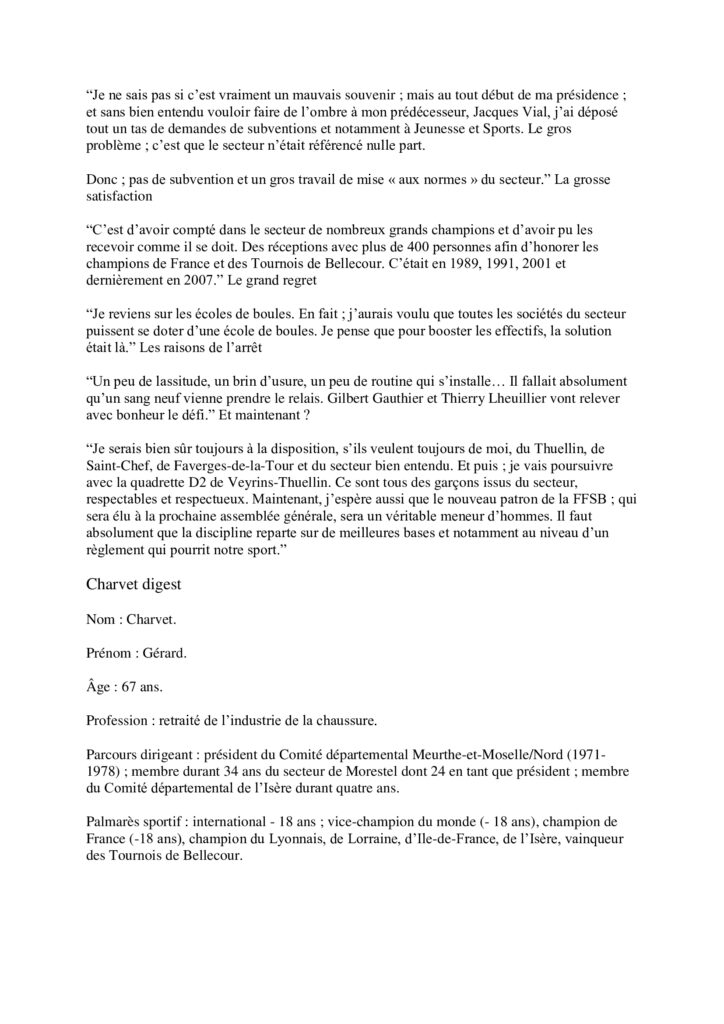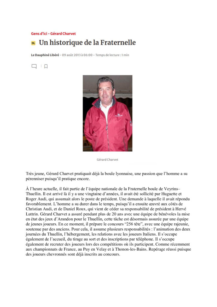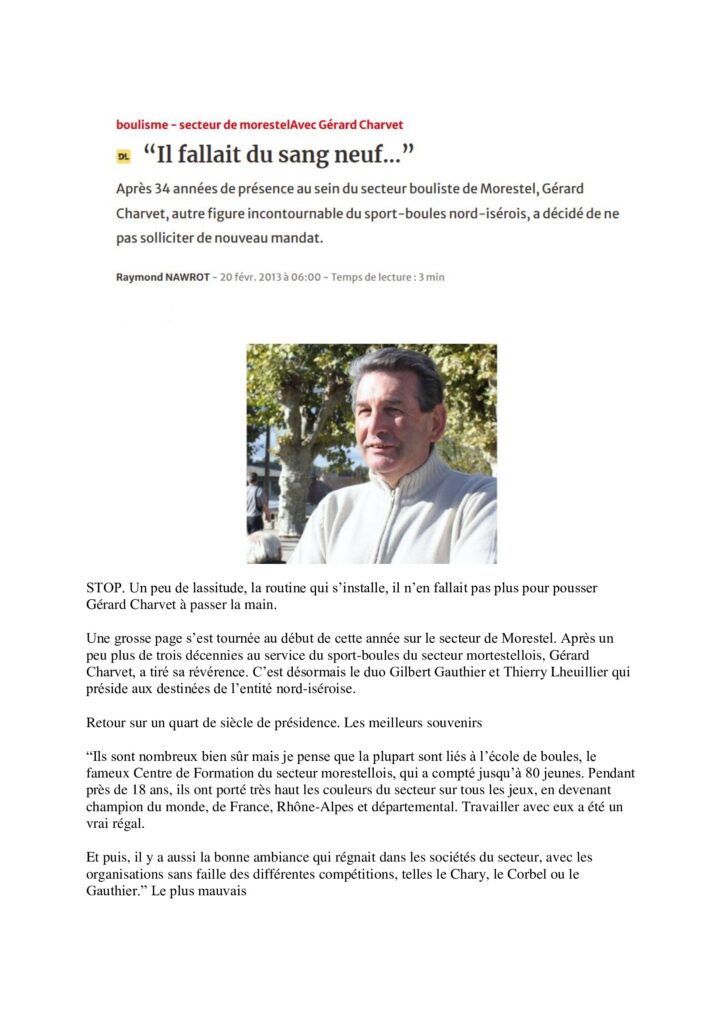 Après un parcours professionnel dans le Grand Est, Gérard s’installe à Passins, près de Morestel. Bouliste dès son plus jeune âge et fort d’un très beau parcours de compétiteur (voir la suite en photos plus bas), il entre dans l’Union Bouliste de Morestel en 1979 au côté du Président Jacques VIAL, et lui succède de 1989 à 2013.